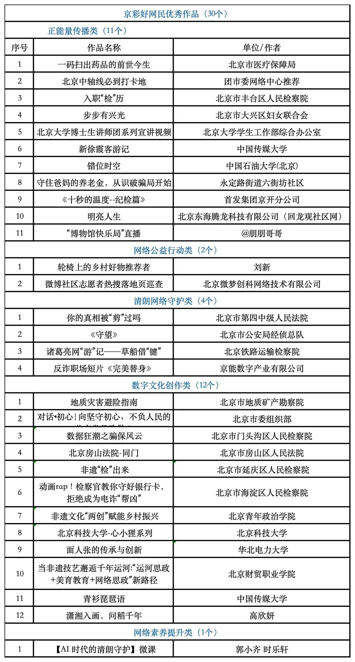 正能量传播类中,北京市医疗保障局的《一码扫出药品的前世今生》、团市委推荐的《北京中轴线必到打卡地》等作品,生动展现了首都民生发展与文化传承创新;网络公益行动类中,刘新的《轮椅上的乡村好物推荐者》和北京微梦创科公司的“微博社区志愿者巡查”项目,体现了“互联网+公益”的创新实践;清朗网络守护类中,北京市第四中级人民法院的《你的真相被“剪”过吗》和北京市公安局经侦总队的《守望》,有效普及了防诈反诈知识;数字文化创作类中,北京市地质矿产勘察院的《地质灾害避险指南》、海淀区检察院的动画RAP反诈宣传等作品,以数字形式弘扬了优秀文化与法治精神;网络素养提升类中,由郭小齐、时乐轩制作的《AI时代的清朗守护》微课,为提升公众网络素养提供了有益参考。