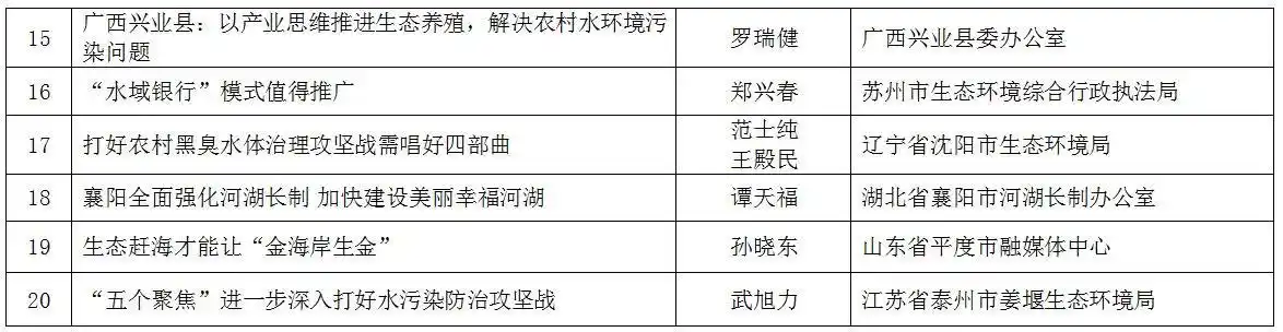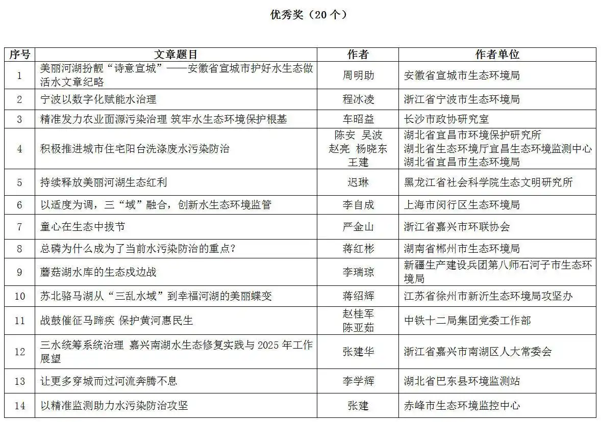 2025年是“十四五”规划收官之年,是深入推进美丽中国建设的关键一年,也是保障“十五五”顺利启航的奠基之年。为做好水生态环境保护2025年度重点工作宣传解读,推进全国水环境形势分析及规划编制项目实施,中国环境报主办了“水生态环境保护2025年重点工作”征文活动。经过专家评定,评选出特别奖10个、优秀奖20个。现将获奖名单公布如下: