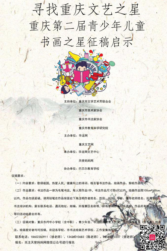 第二届寻找重庆文艺之星“书画”之星开始征集书法、绘画作品,来自全市4-16岁青少年儿童均可向组委会投稿。