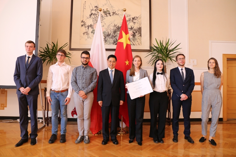 首届“‘一带一路’与波兰”大学生征文比赛由中国驻波兰使馆与华沙大学汉学系共同举办。参赛者为波兰各大学汉学专业的学生。比赛共计收到征文投稿73篇。最终,来自亚当·密茨凯维奇大学的Michalina Niedroszlańska获得一等奖;来自华沙大学的Angelika Rataj及Michał Zacharjasz获得二等奖;来自卢布林天主教大学的 Szymon Włoch、Anna Czapnik以及来自雅盖隆大学的Igor Szpotakowski获得三等奖。