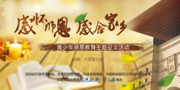 由许昌市文明办、共青团许昌市委、许昌市教育局、中国邮政集团公司许昌市分公司、许昌电视台携手“蓝色经典·梦之蓝”,联合举办“感怀师恩 感念家乡”青少年感恩教育主题征文活动。