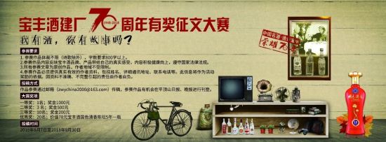 在鹰城,很多人对宝丰酒也许再熟悉不过了。2018年,是宝丰酒业建厂七十周年,为了丰富鹰城人文化生活,培养平顶山文学爱好者,“我与宝丰酒的故事”征文大赛自8月7日起开始征文,现已陆续收到稿件。参赛作品体裁不限(诗歌除外),字数要求800至1200字,征稿时间截止于9月30日。