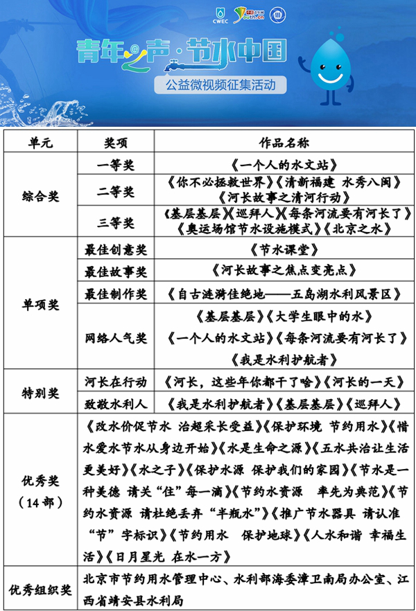 近日,“青年之声·节水中国”公益微视频征集活动获奖作品名单正式揭晓。由全国各地网友和企事业单位等机构创作的30余部入围作品经过网络投票与专家评审两大评审流程,现已角逐出一、二、三等综合大奖,最佳创意奖、最佳故事奖、最佳制作奖、网络人气奖等单项奖以及特别奖、优秀组织奖等奖项。