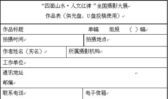 2。光盘、U盘投稿。光盘、U盘包装盒上注明该展名称,每幅作品文件名处注明作品标题,同时提供作者资料及作品信息(word文档)。投稿作品为JPG格式,图片统一处理为长边600-1000像素,文件大小控制在500KB以内。无相关资料的投稿作品,主办单位有权取消其参评资格。投稿作品以光盘(CD-R或DVD-R)、U盘存储形式邮寄至:北京市东城区东四十二条48号 中国摄影报社活动部“江津摄影大展”办公室收(100007)。