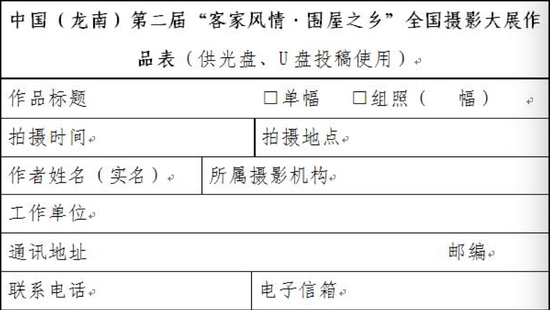投稿作品以光盘(CD-R或DVD-R)、U盘存储形式邮寄至:北京市东城区东四十二条48号中国摄影报社活动部“龙南摄影大展”办公室收(100007)