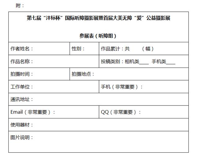 邮箱仅限听障组投稿,邮件主题请注明“第七届沣标杯”,作者须以“作品名称+省份+姓名+投稿组别(如‘听障组相机类’或‘听障组手机类’)”的形式对投稿作品进行命名;听障组作者须填写参展表格,且必须提供作者本人残疾人证明,翻拍或扫描残疾人证均可,随投稿稿件一并发送。