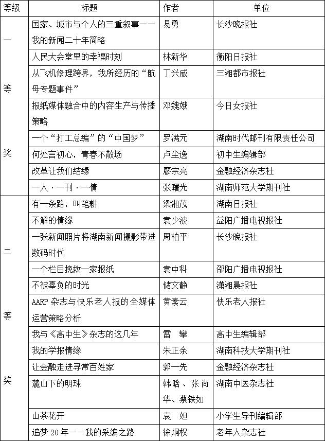 获奖文章多立足平凡的职业岗位,以小见大,见微知著,反映了改革开放40年间湖湘报刊的发展之路。其中荣获一等奖的8篇文章:长沙晚报社易勇的《国家、城市与个人的三重叙事——我的新闻二十年简略》、衡阳日报社林新华的《人民大会堂里的幸福时刻》、三湘都市报社丁兴威的《从飞机修理跨界,我所经历的“航母专题事件”》、今日女报社邓魏娥的《报纸媒体融合中的内容生产与传播策略》;湖南时代邮刊有限责任公司罗满元的《一个“打工总编”的“中国梦”》、初中生编辑部卢尘逸的《何处言初心,青春不散场》、金融经济杂志社廖宗亮的《改革让我们结缘》、湖南师范大学期刊社张曙光的《一人·一刊·一情》,感情真挚,论述饱满,以个体的成长折射时代的风云,是既有意义兼有意思的佳作。