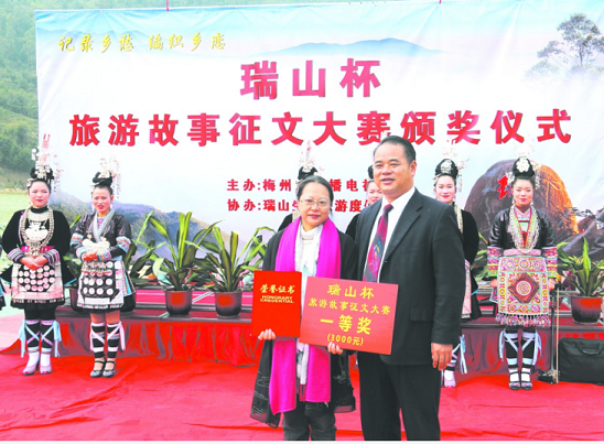 近日,由广东瑞山生态旅游度假村冠名赞助、《梅州市广播电视周报》主办的“瑞山杯”旅游故事征文大奖赛颁奖活动在瑞山圆梦广场举行,10多位获奖作者与现场近百名游客分享了这份喜悦。瑞山董事长蔡俊发亲自为一等奖获得者黄琬雅颁奖(如图)。