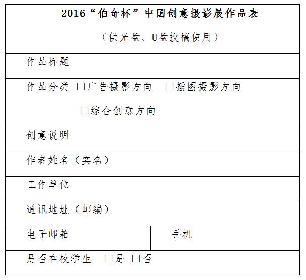 作品以光盘(CD―R或DVD―R)、U盘存储形式寄至北京市东城区东四十二条48号中国摄影报社活动部“2016伯奇杯中国创意摄影展”办公室收(100007)。