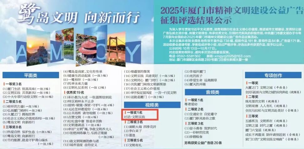 近日,2025年厦门市精神文明建设公益广告征集活动评选结果揭晓。由海沧区委文明办选送的作品《对话·文明实践》,从全国181条视频作品中脱颖而出,荣获视频类一等奖;广告语“点滴小事大家帮,文明实践不打烊”荣获优秀广告语奖。