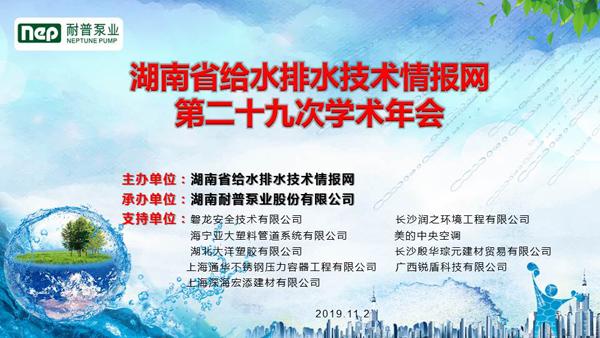 2019年11月2日上午,由湖南耐普泵业股份有限公司承办,美的中央空调等企业赞助支持的湖南省给水排水技术情报网第二十九次学术年会举办,来自全国的相关厂家及湖南省的一百多位优秀设计师欢聚此次盛会,共同对新技术、新方向进行相互学习、深入探讨。