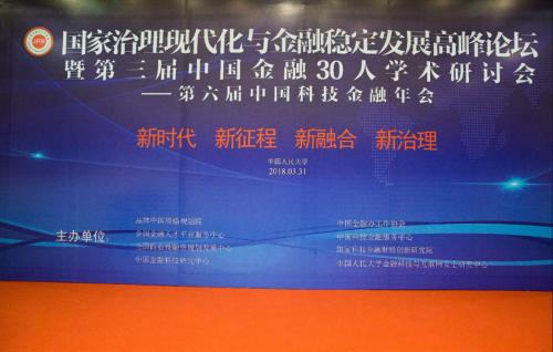 由品牌中国战略规划院、全国金融人才平台服务中心、全国商业投融资规划发展中心、中国金融科技研究中心、中国科技金融服务中心、中国金融办工作协会、中国人民大学金融科技与互联网安全研究中心联合主办,首都国商金控有限公司,中财达证券咨询有限公司,中票信用增进有限公司,奥谷(中国)融资租赁有限公司,上海鑫凸资本公司,河北城典集团有限公司承办的“首届国家治理现代化与金融稳定发展高峰论坛暨第三届中国金融30人学术研讨会———第六届中国科技金融年会”于2018年3月31日在中国人民大学胜利召开。