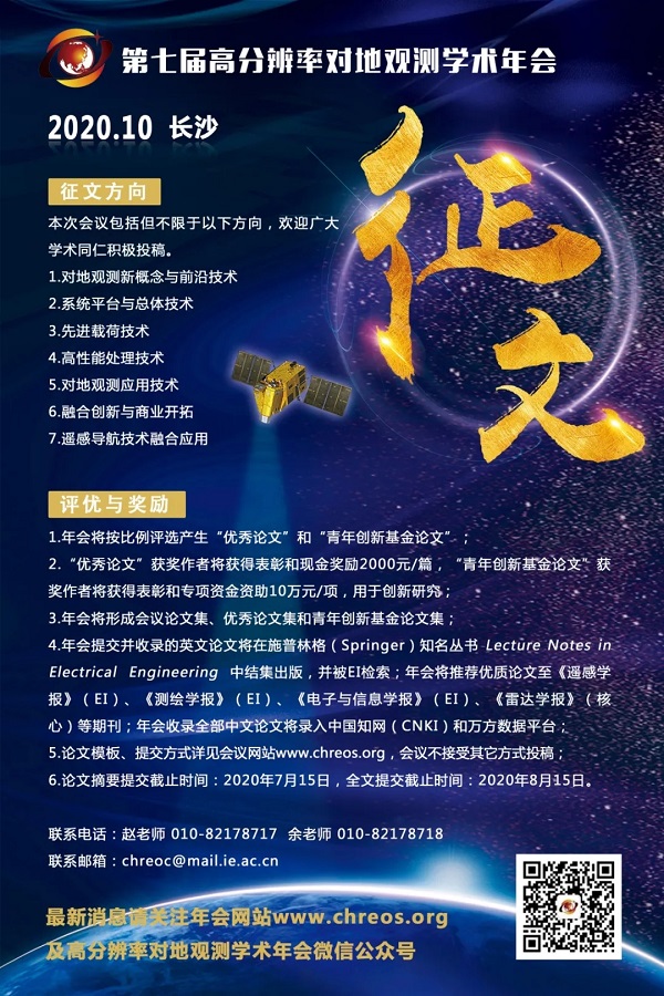 第七届高分辨率对地观测学术年会将于2020年10月在长沙召开。本届年会将继续聚焦高分天基、临近空间、航空、地面、应用等对地观测前沿理论与方法、系统平台与总体技术、先进载荷与高性能处理技术、对地观测应用技术、融合创新与商业开拓、遥感导航技术的融合应用等方向,关注高分辨率对地观测领域面临的挑战、核心技术创新和应用产业的发展,邀请国内外高分辨率对地观测领域资深专家、学者参会,通过大会报告、分会场研讨等活动,全方位展示高分辨率对地观测领域取得的研究成果并进行深入交流,支持我国高分辨率对地观测事业持续健康发展。