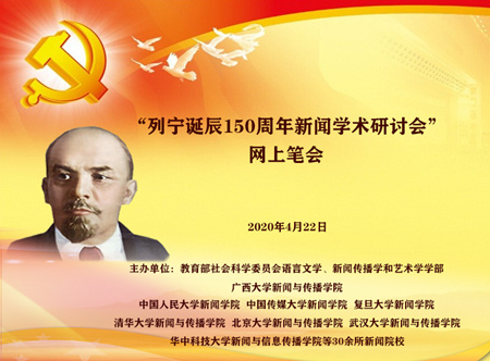 2020年4月22日,“纪念列宁诞辰150周年新闻学术研讨会”网上笔会在广西大学举行。笔会由教育部社会科学委员会学部委员兼新闻传播学科召集人、广西大学新闻与传播学院院长、中国人民大学新闻与社会发展研究中心原主任郑保卫教授主持。