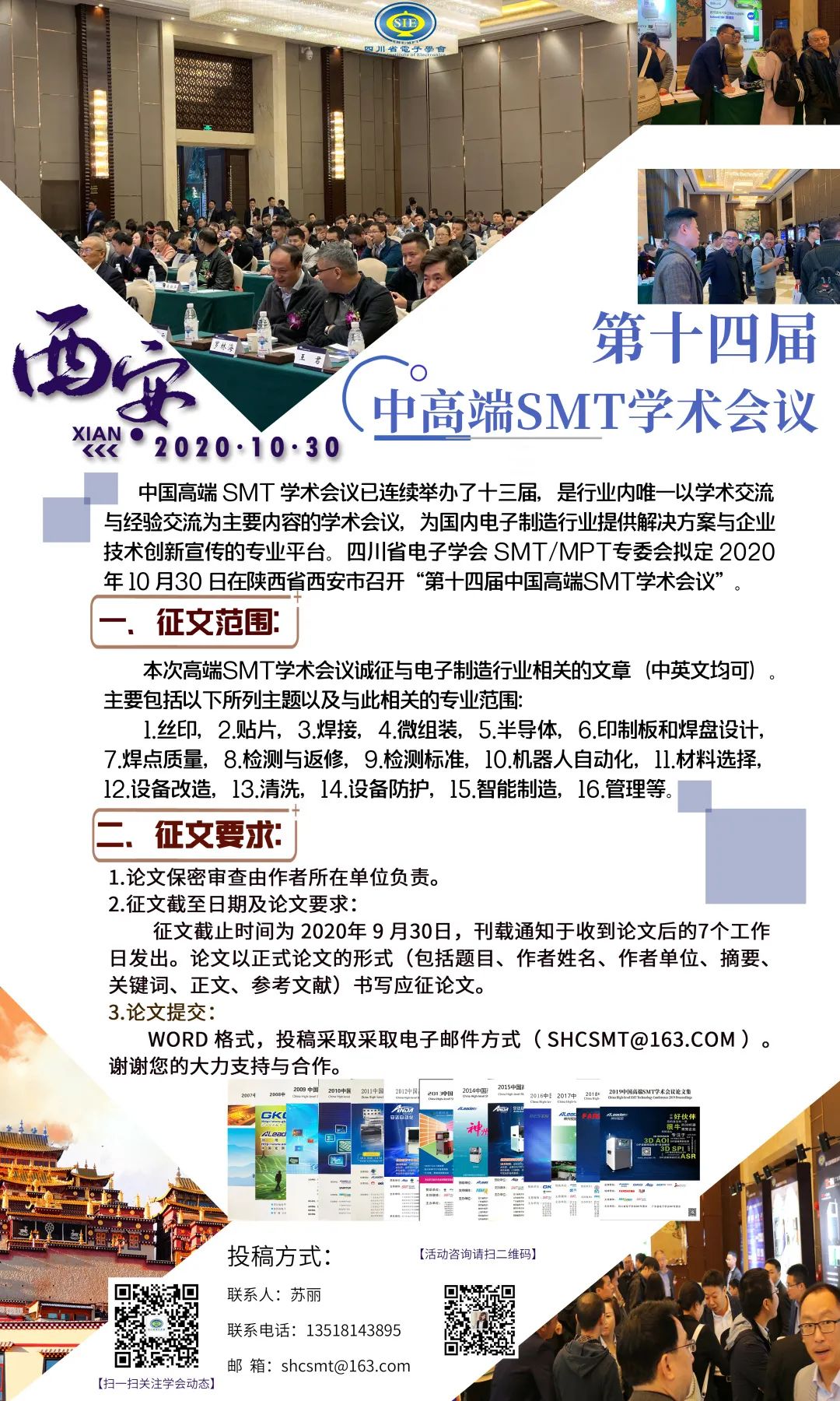 我国的电子信息制造业的发展极为迅速,电子制造业成为国民经济的战略性、基础性和先导性支柱产业,成为当今经济社会发展的重要驱动。随着产业环境的变化,国际向国内,国内东南沿海向中西部地区转移步伐进一步加快,并呈现新的趋势,中西部增势明显,成为未来投资与发展的重点。陕西作为我国电子信息产业在西部的一个重要产业区域,电子信息产品制造业竞争优势与规模效益已形成。四川电子学会SMT/MPT专委会、广东省电子学会SMT专委会拟定于2020年10月30日在陕西省西安市举办“第十四届中国高端SMT学术会议”。电子装备的自动化程度高低,是衡量一国是否为电子制造强国的标志。实现电子制造强国梦,必须走SMT设备的自主研发之路。为了促进电子制造技术的发展,加快推进智能制造,有效推动电子制造业产业链升级,使我国从电子产品的“制造大国”向“制造强国”迈进。智能制造是当前和今后一个时期推进两化深度融合的核心目标,也是建立国家制造业创新体系的关键。