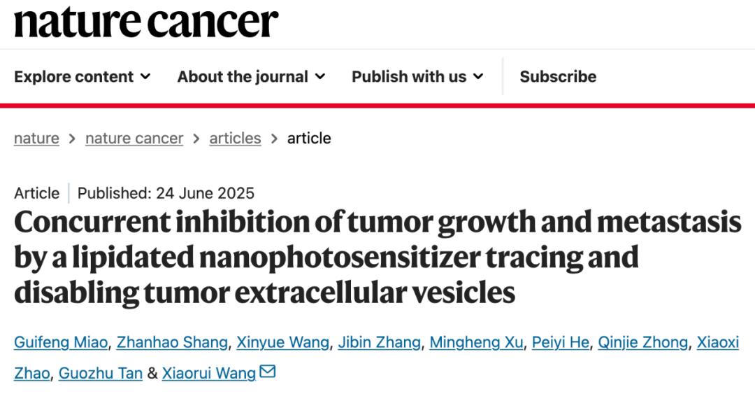 近日,南方医科大学生物医学工程学院汪枭睿教授团队(苗贵凤博士和商展豪硕士为论文共同第一作者)在 Nature 子刊 Nature Cancer 上发表了题为:Concurrent inhibition of tumor growth and metastasis by a lipidated nanophotosensitizer tracing and disabling tumor extracellular vesicles 的研究论文。