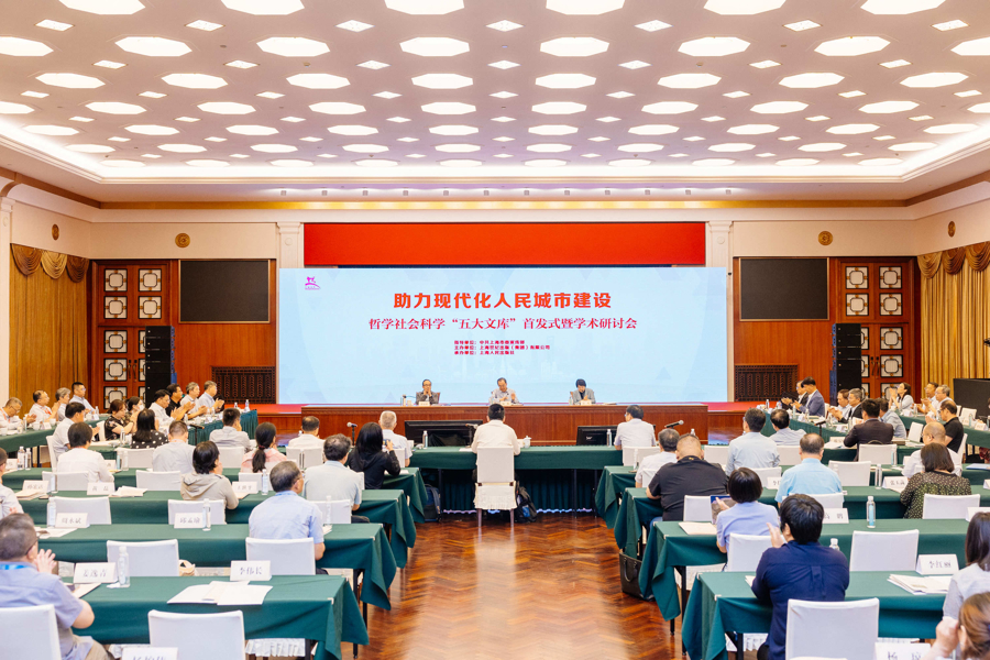 8月14日上午,由中共上海市委宣传部指导、上海世纪出版集团主办、上海人民出版社承办的“助力现代化人民城市建设——哲学社会科学‘五大文库’首发式暨学术研讨会”在上海展览中心友谊会堂举行。来自本市高校、科研院所、智库机构和出版单位的专家学者100余人与会,共同见证首批“五大文库”新书揭幕,并聚焦中国式现代化发展热点,共同探讨繁荣发展哲学社会科学、构建中国哲学社会科学自主知识体系的路径与经验。