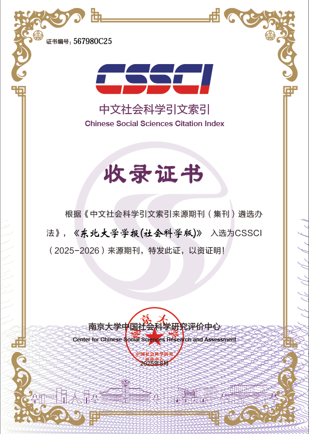 近日,东北大学学报(社会科学版)收到来自南京大学中国社会科学研究评价中心的收录证书,根据《中文社会科学引文索引来源期刊(集刊)遴选办法》,《东北大学学报(社会科学版)》入选为CSSCI(2025-2026)来源期刊。