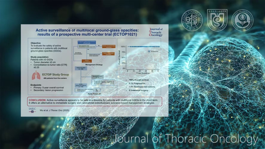 近日,国际肺癌研究领域权威期刊《Journal of Thoracic Oncology》在线发表了一项由复旦大学附属肿瘤医院胸外科陈海泉教授牵头、国内多家医疗中心共同参与的前瞻性多中心临床研究成果。这项全球首个针对174名多发磨玻璃肺结节患者的主动随访研究,首次公布患者生存数据。研究首次证实:对于特定类型的肺多发性磨玻璃结节(又称GGO)患者,在“外科治愈窗口期”内实施主动监测策略安全可靠,提出“多发GGO的选择性根治术”,为即刻手术之外的个体化治疗提供了循证依据。