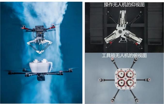 该空中协同操作系统由一个工具箱微型飞行器(toolbox MAV)和一个操作微型飞行器(manipulator MAV)组成。可在高达 13.18 米/秒的“下洗气流”存在的情况下,操作 MAV 的机械臂能够自主对接工具箱 MAV 中所携带的工具,对接精度达到 0.80 ± 0.33 厘米。