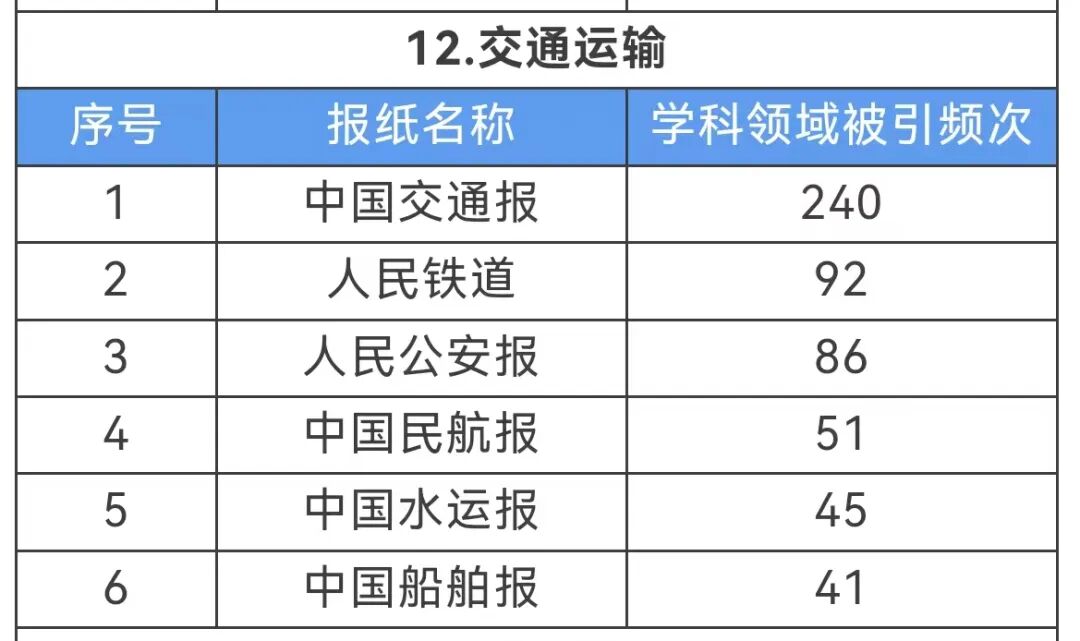 近日,中国知网·中国科学文献计量评价研究中心(出版智库)发布《高学术影响力中国报纸评价报告(2025)》(简称《报告》),中国交通报入选“2025年度高学术影响力中国报纸”。《报告》显示,本报被交通运输类别学术文献引用240次,位居首位,体现了本报在交通运输学科领域学术研究中的应用价值。