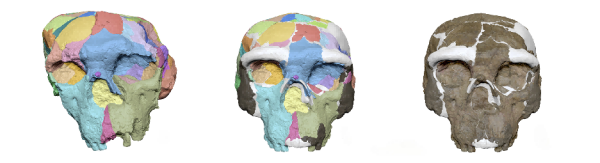 研究团队采用高精度CT扫描与结构光表面扫描技术,清晰识别出郧县人2号化石中的裂隙、矿物填充和未变形的骨片,随后通过创新的数字重建方法,根据解剖结构和几何形态学标志点,以虚拟方式完成了头骨的精细拼接。