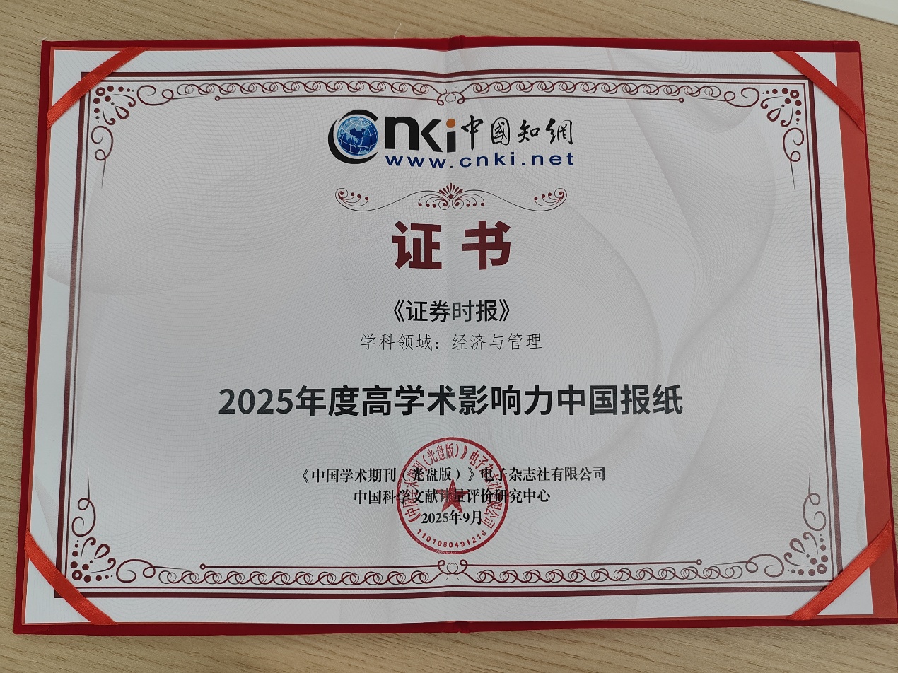 日前,中国知网·中国科学文献计量评价研究中心(出版智库)举办的“报纸学术影响力创新与发展论坛”在山西太原成功召开。会上发布了《高学术影响力中国报纸评价报告(2025)》。《证券时报》顺利入选经济管理类“2025年度高学术影响力中国报纸”。