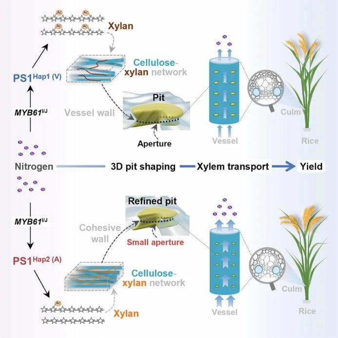 通过水稻全基因组关联分析,研究团队鉴定出一个控制纹孔大小的数量性状基因——PS1,该基因编码一种木聚糖去乙酰酶(xylan deacetylase),可调控纹孔的几何形态。一个优良 PS1 等位基因通过使木聚糖处于低乙酰化状态,促进其与纤维素的结合,从而维持纹孔边界处细胞壁的连贯性。含有该优良单倍型的水稻品种表现出增强的氮运输能力和稻谷产量。