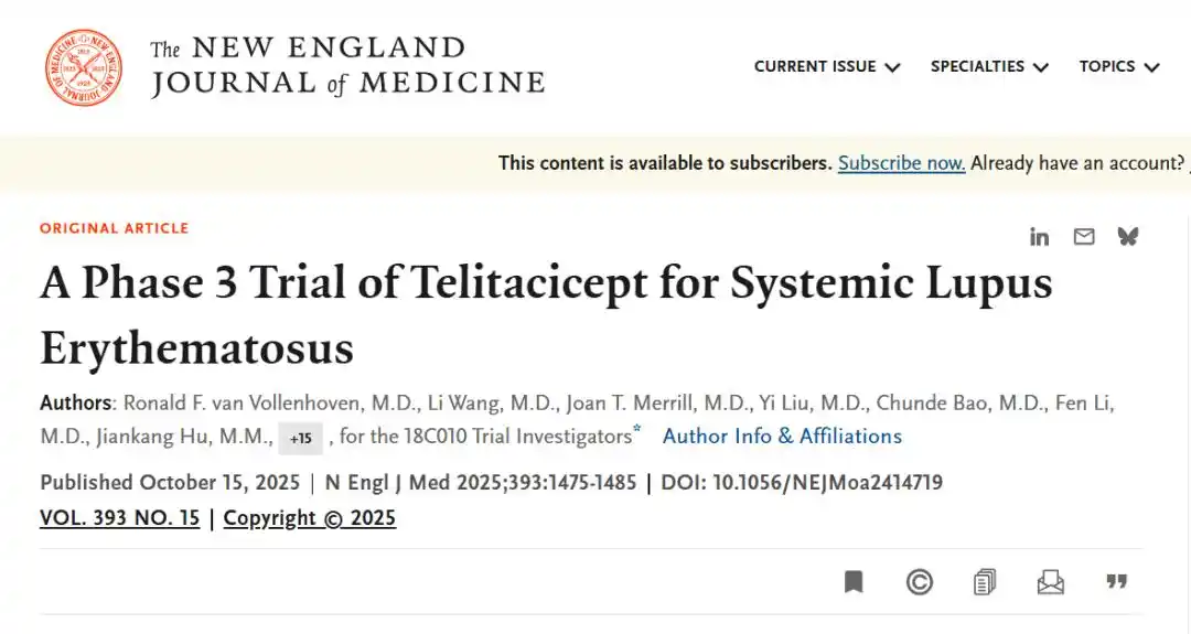 10月16日,荣昌生物宣布,泰它西普治疗系统性红斑狼疮(SLE)的中国Ⅲ期临床研究成果,重磅发表于国际顶级医学期刊《新英格兰医学杂志》(NEJM)。