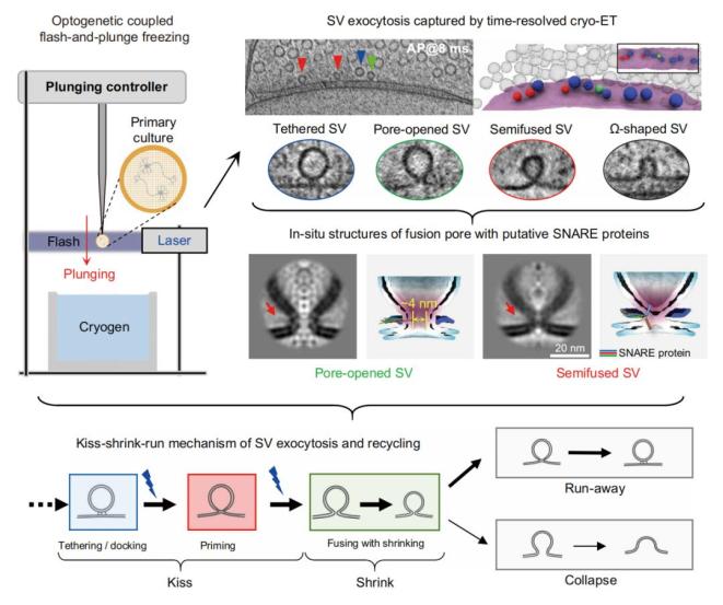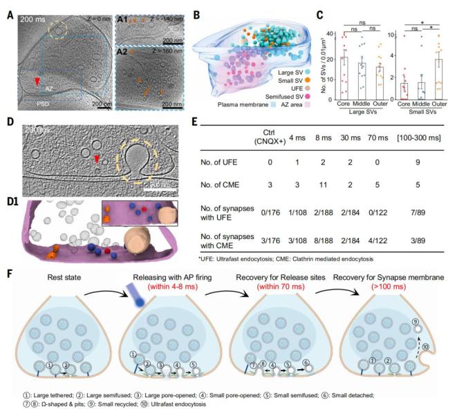 该研究通过自主研发的毫秒级时间分辨原位冷冻电镜成像技术,破解了神经信号传递过程中,突触囊泡释放与快速回收的生物物理过程——“亲吻-收缩-逃逸/融合”(Kiss-Shrink-Run/Collapse)。这一成果统一了半个世纪以来关于突触囊泡释放与回收机制的两个争议模型,为理解神经信号传递、神经可塑性及相关脑疾病机理提供全新视角。