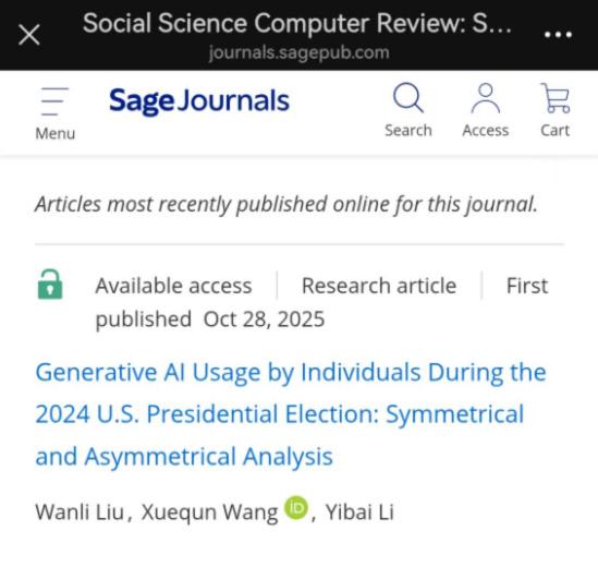 近日,广州新华学院董事会董事、中山大学政治与公共事务管理学院博士研究生刘婉莉作为第一作者完成的学术论文《Generative AI Usage by Individuals During the 2024 U.S. Presidential Election: Symmetrical and Asymmetrical Analysis》,在国际知名SCI/SSCI期刊《Social Science Computer Review》正式发表。