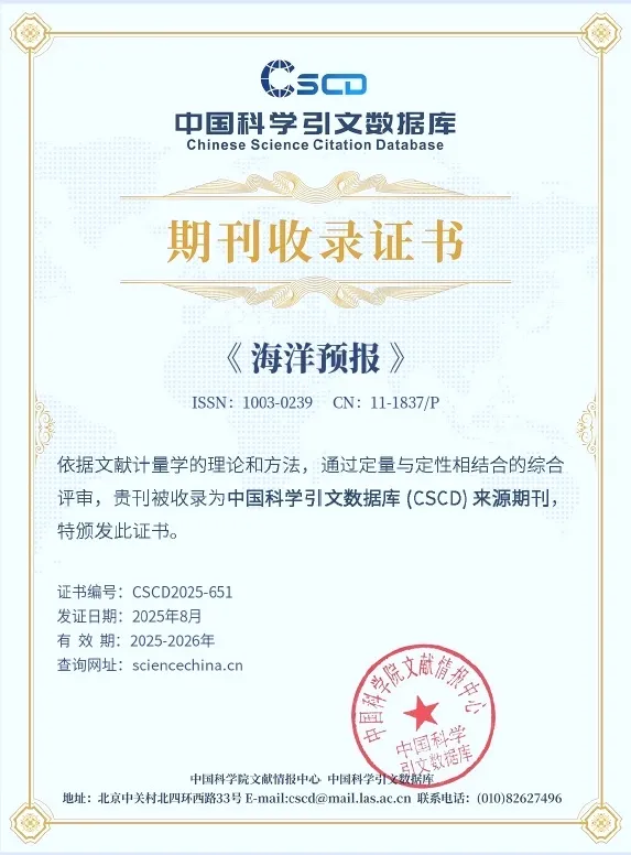 中国科学院文献情报中心正式发布了2025-2026年中国科学引文数据库(CSCD)名录,《海洋预报》继续被收录。