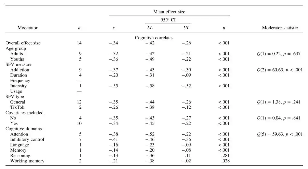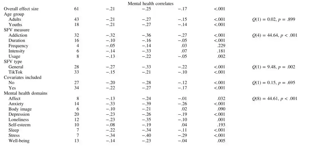 基本结论是短视频 (SFV) 的增加使用与“更差的心理健康”呈显著的、弱的负相关 (r = -.21) 。
