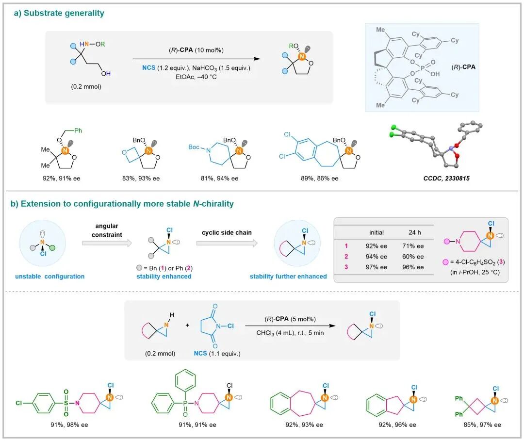 经大量尝试,研究团队基于自主开发的手性磷酸催化剂库,成功实现了羟胺类底物的催化不对称氯化反应。通过在底物中预先引入羟基,实现了反应速率显著提升的分子内亲核取代,从而顺利完成手性传递,最终获得构型稳定的N-手性化合物。