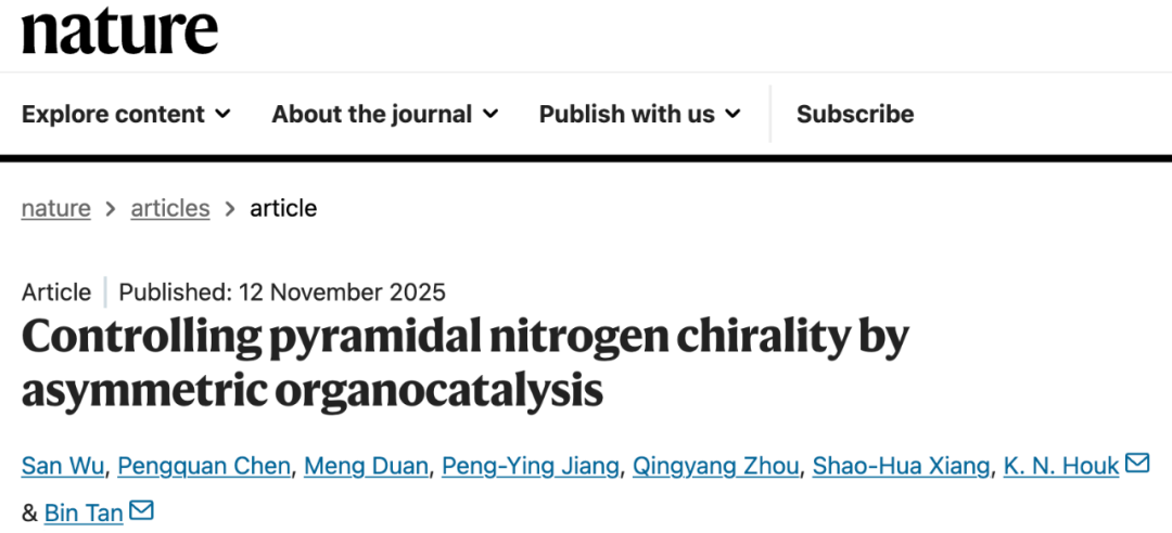 2025年11月12日,南方科技大学谭斌团队与加州大学洛杉矶分校K.N.Houk团队合作(吴三、陈鹏全、段梦为共同第一作者),在国际顶尖学术期刊Nature上发表了题为:Controllingpyramidalnitrogenchiralitybyasymmetricorganocatalysis的研究论文。