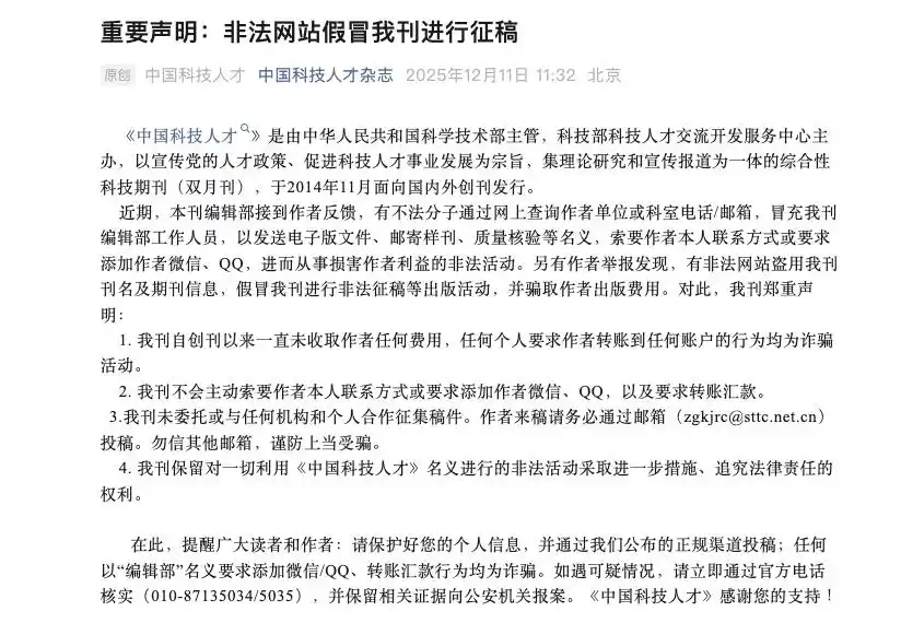 此前的12月11日,《中国科技人才》杂志官方微信公众号曾发布声明称“非法网站假冒我刊进行征稿”,“我刊自创刊以来一直未收取作者任何费用,任何个人要求作者转账到任何账户的行为均为诈骗活动。”