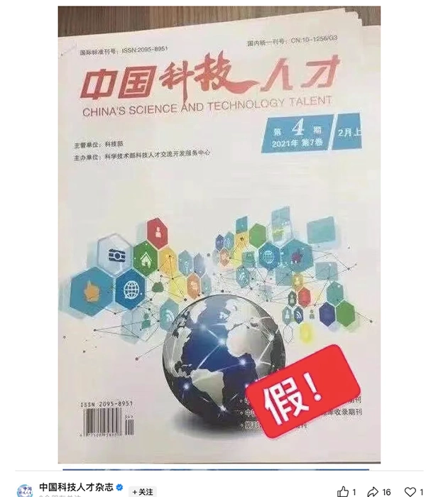 《中国科技人才》杂志发布的假刊示例。