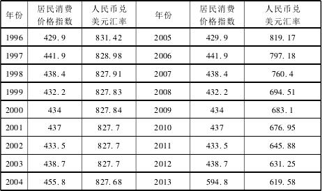 我们选择 CPI (1978 = 100) 作为物价分析指标。在汇率方面,鉴于美元在全球货币中的地位,我们采用人民币兑美元汇率 (美元 =100)来代表人民币的对外价值。下面就结合我国 1996 年至 2013 年的居民消费价格指数和人民币兑美元汇率的年度数据 (见表 1) ,以及各种物价和汇率信息,简单了解我国近年来的物价和汇率情况: