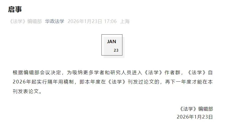 一条权威期刊的“隔年用稿制”近日引起学者关注。1月23日,《法学》编辑部发布启事称:根据编辑部会议决定,为吸纳更多学者和研究人员进入《法学》作者群,《法学》自2026年起实行隔年用稿制,即本年度在《法学》刊发过论文的,再下一年度才能在本刊发表论文。