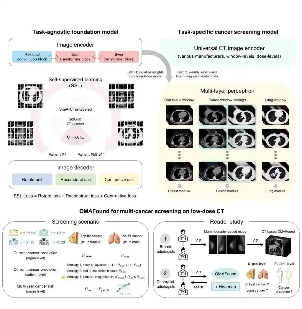 该研究构建基于普通CT的“一扫多筛”癌症筛查模型OMAFound,实现对全球男性发病率第一的肺癌与女性发病率第一的乳腺癌的同步精准筛查,为破解传统“单癌单检”模式带来的时间成本、经济负担及医疗资源占用等难题提供了全新路径,未来可扩展至其他常见癌症的多癌种筛查,具有重要的临床价值与学术意义。