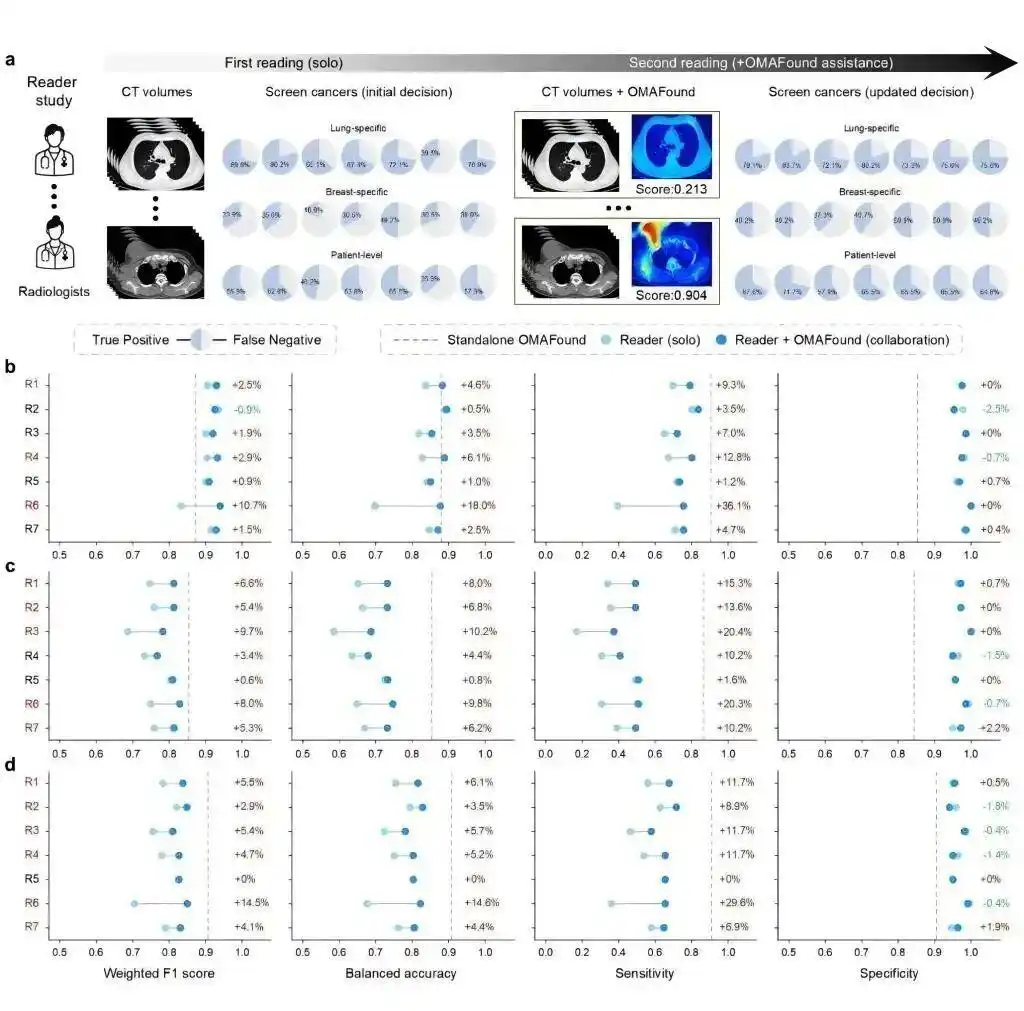 OMAFound在个体与器官水平对临床医生的癌症检出率的帮助。