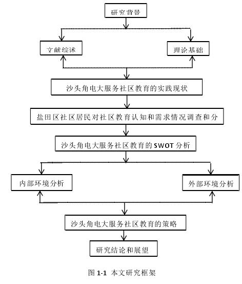 本文主要探讨深圳沙头角电视大学更好服务社区教育的策略,研究内容主要包括以下部分:一是,理论分析部分,包括绪论和理论基础。提出本文研究主题来源,研究目的、意义和方法,综述现有电大开展社区教育相关研究,简要阐述理论基础。二是,实践分析部分,包括深圳沙头角电大转型服务社区教育的实践情况,对盐田区社区居民的社区教育认知和需求情况进行问卷调查和分析,以及进行内外部的优势、劣势、机会和威胁分析以建立swoT分析矩阵;三是,发展策略研究。根据以上对沙头角电视大学服务盐田区社区教育的现状和swoT分析,本文从各方面提出发展对策。根据研究内容,本文的研究框架如图1-m