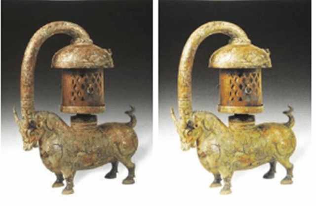 原来这个油灯叫做云纹铜牛灯,他的特别在于他是一个非常环保的工具,拥有着现在科技都不能比拟的环保功能。这件铜牛灯造型奇特,灯罩通过延长的牛角与牛腹相连,当灯点燃之后,产生的烟就会顺着导管飘进牛腹中。牛腹中有事先放好的水,烟进入水中之后就会被过滤,以产生环保的作用。