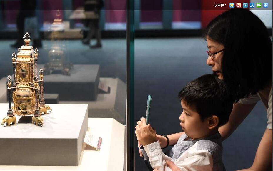 5月13日,正在福州福建博物院举办的“风华清漪——颐和园藏乾隆文物特展”吸引民众前来观展。此次文物特展共展出颐和园藏乾隆文物79件(套)。图为母子俩用手机拍摄展品《铜镀金嵌珐琅六柱座钟》。(记者 刘可耕 )