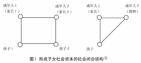 在针对社会资本的研究中,科尔曼较为强调社会闭合的作用。社会闭合主要指社会网络的封闭,主要是指代际间的交流、家长间的交往,以及家长和学校的沟通情况。在他看来,当父母与子女之间、父母与社区其他成年人之间的社会交流充分、社会网络封闭性高时,子女就会得到较丰富的社会资本,从而更有机会获得学业成功。社会闭合还可以再进一步分为父母参与和代际闭合,前者指涉家庭内部家长与子女的关系网络状况(包括监督和学习指导等),后者则指向家庭之外家长之间、家长与老师间的关系网络状况。