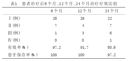 2.3患者治疗后6个月、12个月、24个月治疗疗效比较患者治疗后6个月、12个月、24个月治疗疗效分别为97.2%、91.7%、80.6%,患牙保存率分别为100%、100%、97.2%(表1)。
