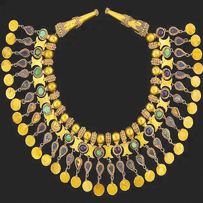 河南省文物局科技外事处副处长陈彦堂透露,此次展览的231件套展品可谓件件精品,但其中的“明星展品” 当属由黄金打造的“黄金王冠”。“这个黄金王冠由若干片组装而成,可以拆解、便于运输,当时作为礼仪象征,王冠背后的故事引人注目。”陈彦堂表示,此外还有宣传图片上的项链,“这条由黄金打造,镶嵌有绿松石,非常精美。大家一般会把黄金、宝石当成权力、财富象征,而这样的展品中类似的有很多。”