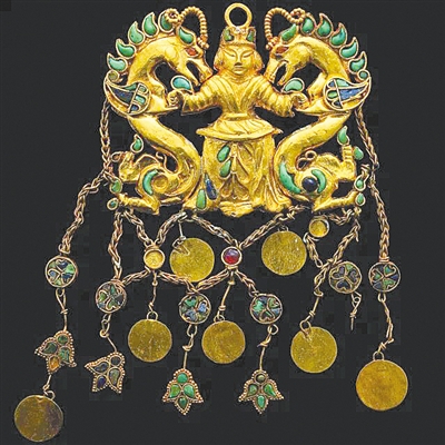 展览的最大亮点是出土于蒂拉丘地墓葬群的众多金器。20世纪70年代,考古学家在蒂拉丘地共发掘出土21618件精美金器,是丝绸之路最伟大的考古发现之一。这些璀璨夺目的金器,包括造型奇美、巧夺天工的纯金王冠;装饰有多组希腊酒神狄俄尼索斯徽章、工艺精湛的纯金腰带;足金打造的巴克特里亚阿芙洛狄忒金像的胸饰、骑海豚的厄洛斯金钩扣以及镶满绿松石的黄金宝剑、嵌有众多宝石的黄金项链等,美轮美奂,熠熠生辉。据学者研究,蒂拉丘地墓葬群的埋藏年代在公元25至50年之间,此一时期正值贵霜帝国的勃兴之际,来自欧亚草原的游牧部落,取代希腊人在巴克特里亚(我国历史上所称的“大夏”)的统治,这批游牧民族正是《史记》所载从中国迁徙而来的大月氏。因此,“巴克特里亚黄金宝藏”中很多金器都带有东方中国的因素。