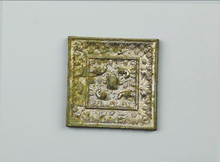 平凉市博物馆藏有数件唐代海兽葡萄纹铜镜,其中有两件铜镜纹饰精美,工艺精湛,堪称珍品。其中的一件为方形(图②),伏兽钮,钮外由一凸起方框分为内外两区,内区四海兽追尾环列,四角饰孔雀屏纹,其系空间点缀十四串枝蔓缠连的葡萄和十二禽鸟,禽鸟六飞六栖。另外一件为圆形(图③),直径13.7厘米,镜钮为伏兽形,镜边缘有一圈花瓣纹饰,中间一圈凸弦纹将镜背分为内外两区,葡萄和叶蔓铺地,布满镜背。内区有姿态各异的6只海兽攀缘逐戏于葡萄叶蔓之间;外区有8只形态各异的禽鸟嬉戏于葡萄的枝蔓叶实之间,另有蝴蝶和蜻蜓相间环绕飞舞。海兽葡萄纹铜镜,亦称“瑞兽葡萄镜”“海马葡萄镜”“天马葡萄镜”“鸾兽葡萄镜”,主要流行在唐高宗、武则天时期,是唐代制镜技术最具代表性的作品之一。