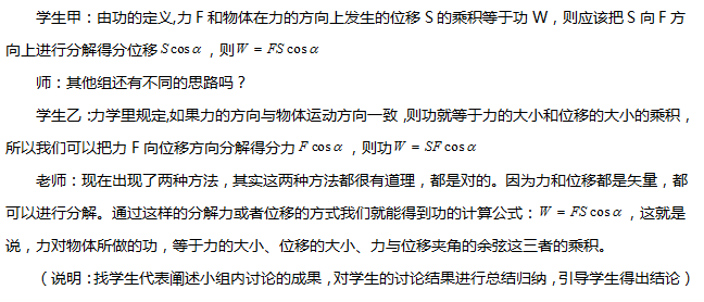 老师:我们由初中的学习知道做功是需要力的作用的,也知道了力与位移方向相同、垂直时功的计算公式。那么一个力F作用在物体上,物体位移是S,力与位移之间有一个夹角时,力F对物体做了多少功呢?给大家3分钟时间同学们4人一小组讨论一下,讨论结束之后找一些小组来说说他们组的结果。